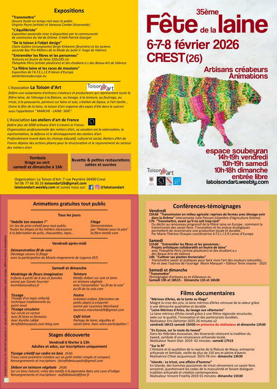Le thème de cette édition organisée par l’association « La Toison d’Art » est : « Transmettre ». 60 artisans, films, ateliers, œuvre collective… Venez mettre la main à la pâte !