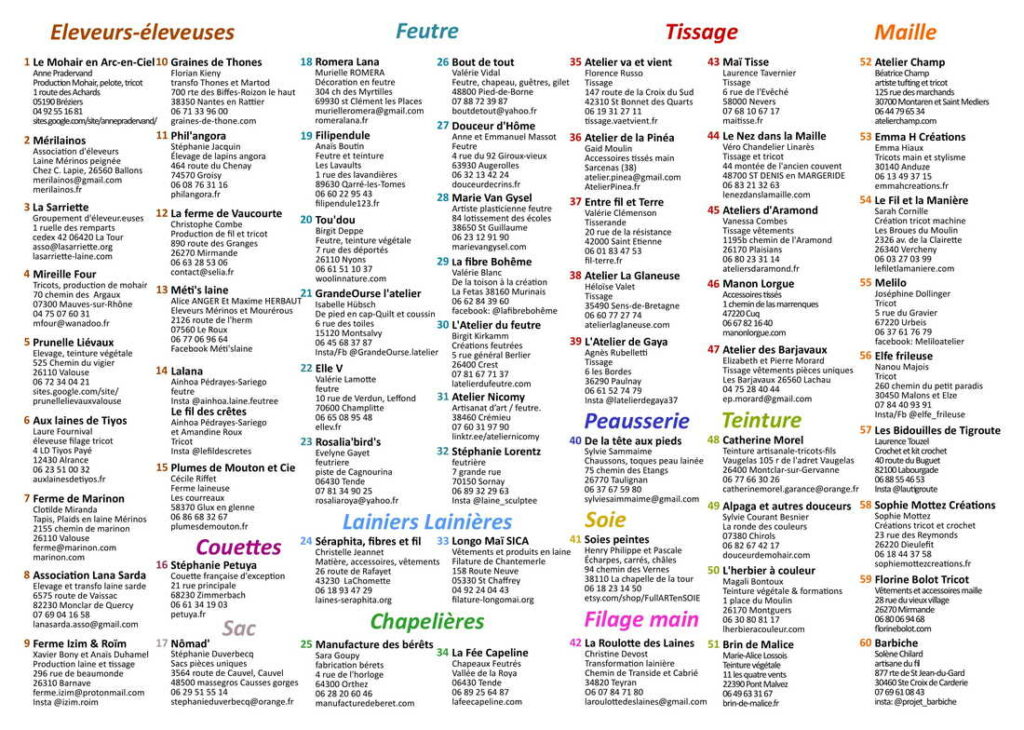Vous y rencontrerez des éleveurs producteurs de matières premières naturelles (laine, mohair, angora…), des artisans du textile (tricot, tissage, feutre, filage, teinture…), un artisanat de qualité avec une production à petite échelle et bien souvent des pièces uniques.