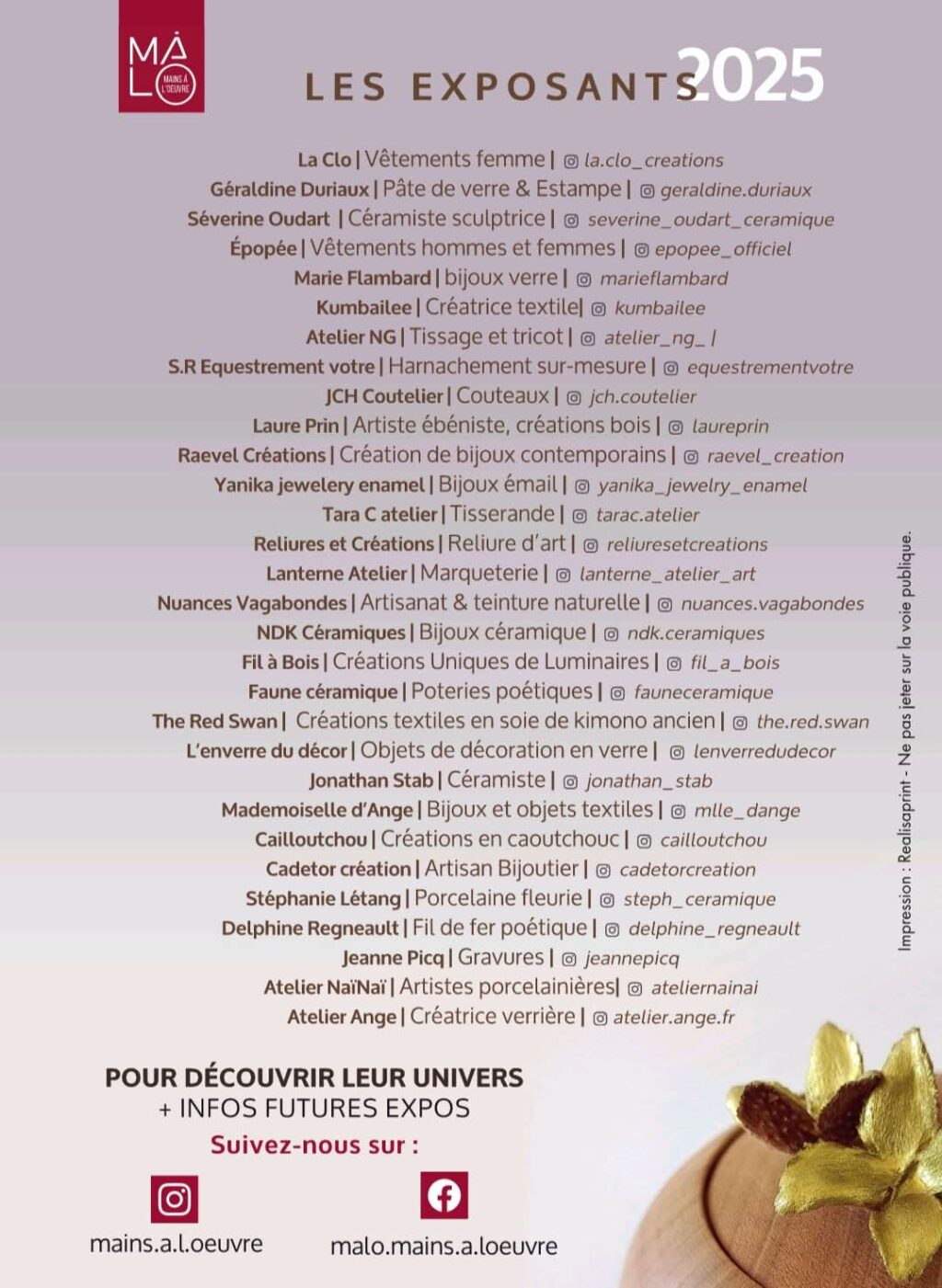 Une trentaine d’artisans et artisanes seront présents pour vous faire découvrir leurs créations : céramistes, travail du verre, du bois, textiles sous diverses formes, bijoux contemporains, orfèvrerie, luminaires, décoration, gravure, teinture naturelle, coutelier…