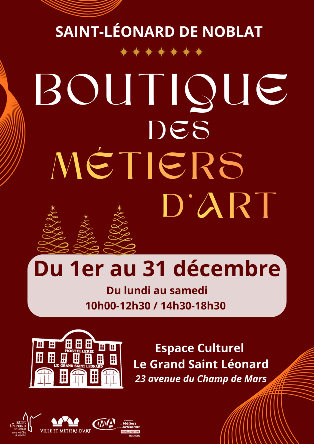 Exposition-vente des artisans d’art de la magnifique cité qu’est Saint Léonard de Noblat. Idées cadeaux et vitrines des savoir-faire locaux dans l’ambiance féérique et magique d’un centre-ville médiéval aux couleurs de Noël. Les artisans d’art seront présents pour dévoiler leurs créations et l’excellence de leur savoir-faire.