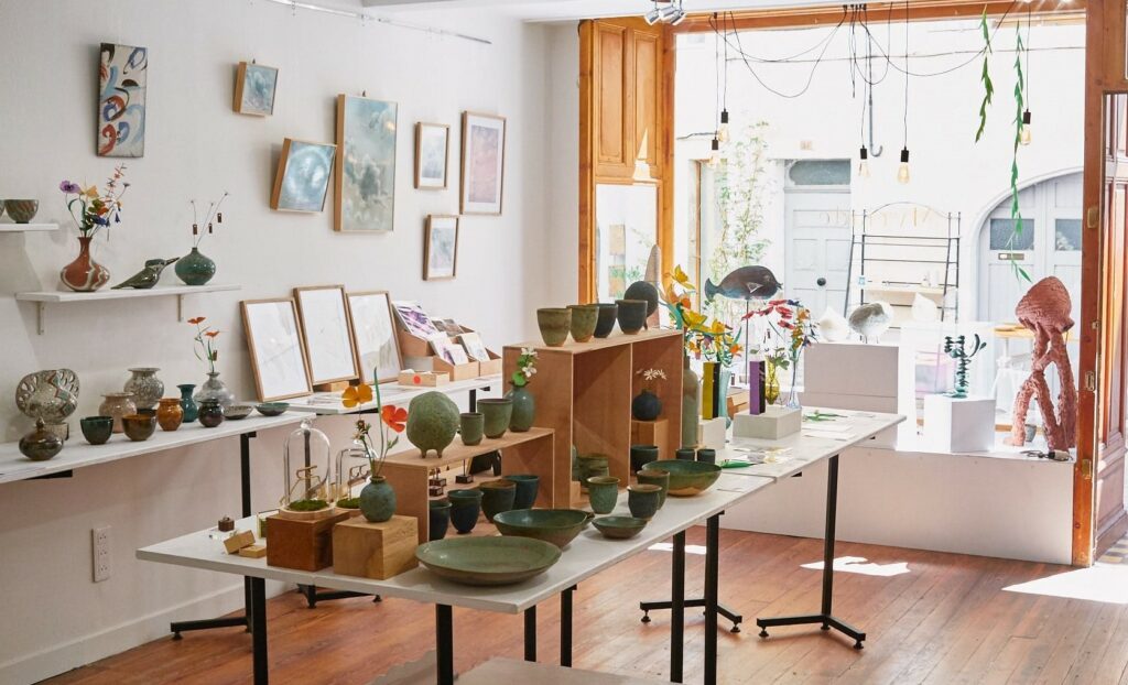La boutique permet la valorisation et la promotion en système collectif des artistes et artisans et met également en place des actions d’animation (ateliers, stages) et des évènements.