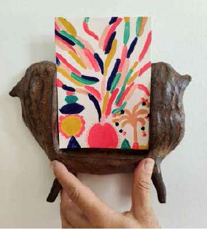 L’exposition présente également la collaboration entre la graveuse Clothilde Staës et la céramiste Maud Louise-Marie. Réunies autour du projet Horizontal Playground, développé lors d’une résidence de création en 2025 au Polinno à Joyeuse, elles ont imaginé un terrain d’expérimentation commun où les formes, les couleurs et les matières dialoguent librement. Les monotypes colorés de Clothilde Staës répondent aux volumes en grès engobé de Maud Louise-Marie : têtes suggérées, montagnes renversées, silhouettes animales ou formes abstraites composent un parcours visuel ludique, où textures et couleurs se font écho.