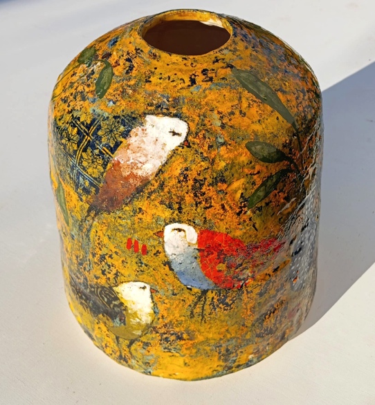 Parmi eux, l’Atelier les Engobés, formé par Marie Balme et Simon Bellégo, explore depuis plus de vingt ans une création partagée. Dans leur atelier breton, les pièces passent librement d’une paire de mains à l’autre : chacun peut façonner, tourner ou décorer la faïence, sans répartition stricte des tâches. De cette liberté naît une grande variété de formes – bols, gobelets, assiettes, vases ou pavements céramiques – réalisées aux engobes et recouvertes d’un émail transparent et brillant. Marie apporte souvent une dimension graphique, faite de motifs au tampon, de superpositions et de traces de coulures, tandis que Simon développe un univers figuratif, peuplé de paysages et de corps en mouvement. Leurs créations conjuguent ainsi couleurs, textures, jeux graphiques et légèreté.