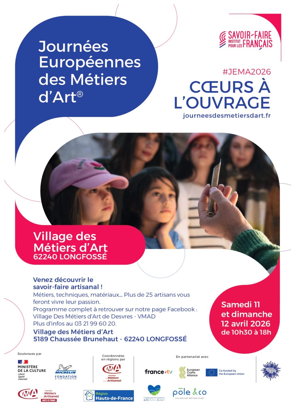 Du vendredi 10 au dimanche 12 avril 2026, le Village des Métiers d’Art de Desvres ouvre ses portes à l’occasion des Journées Européennes des Métiers d’Art (JEMA), organisées cette année autour du thème « Cœurs à l’ouvrage », qui met à l’honneur la force du collectif, les synergies culturelles et territoriales et le dynamisme des territoires.